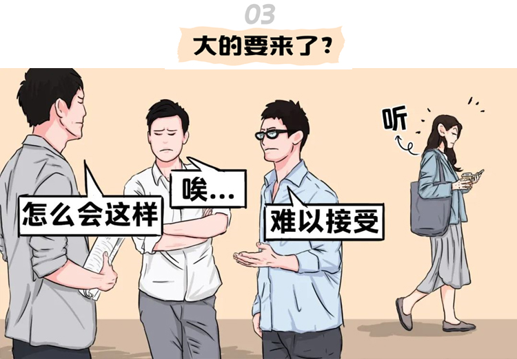 午休时间,Cathy看到公司一大堆男同事聚在楼下聊着什么。有人抱膀叹息,有人吞云吐雾,有人眉头紧锁...个个都是愁眉苦脸。此般情景,让Cathy心中不禁产生种种不好的猜测:“糟了!难道是...大的要来了?”