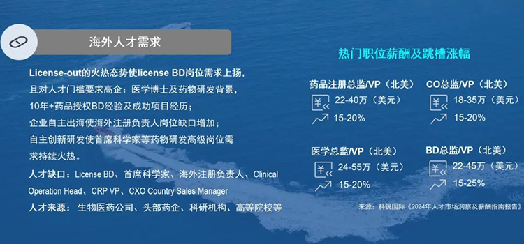就海外人才需求而言, License-out的火热态势使license BD岗位需求上扬;企业自主出海使海外注册负责人岗位缺口增加;自主创新研发使首席科学家等药物研发高级岗位需求持续火热。