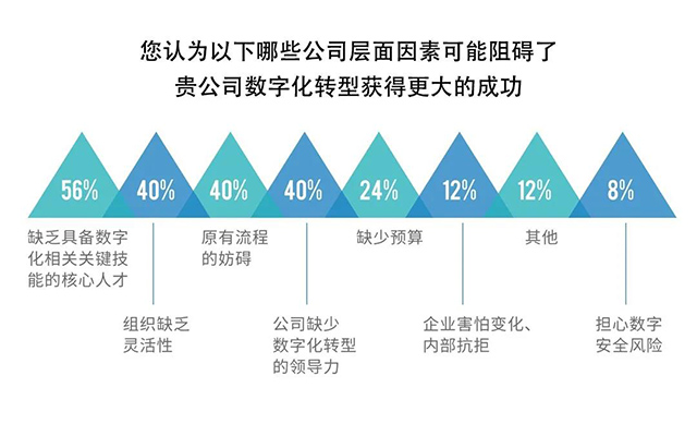 在此次调查中,当我们问及企业认为哪些因素是影响公司数字化转型的内部因素时,人才和组织也是被提及最多的。其中,被选择最多的是缺乏数字化相关关键技能的核心人才。其次是组织灵活性、组织流程问题以及缺少数字化转型领导力等。