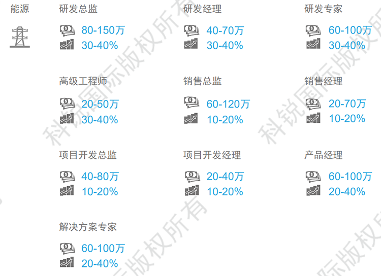 薪酬趋势:行业整体薪酬趋稳,自然涨幅在8-12%,跳槽涨幅在20-30%。能源互联网领域资深人才紧缺,部分职位薪资涨幅可达50%,甚至更高(文中部分数据是猎头公司非凡国际