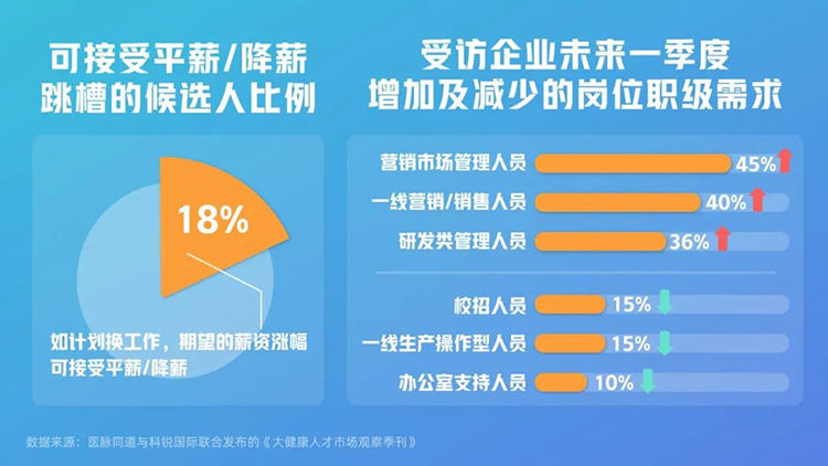 人力资源公司联合发布的《大健康人才市场观察季刊》显示:当前,医药市场整体人才流动趋于理性,对跳槽的薪资涨幅预期有调整,可接受平薪/降薪的候选人比例达18%。未来一季度,受访医药企业增加的岗位职级需求,主要集中在营销市场、一线销售、研发管理岗,占比分别为45%、40%、36%。而减少的职级以办公室支持人员、校招人员、一线生产操作型人员为主,占比分别为10%、15%、15%。