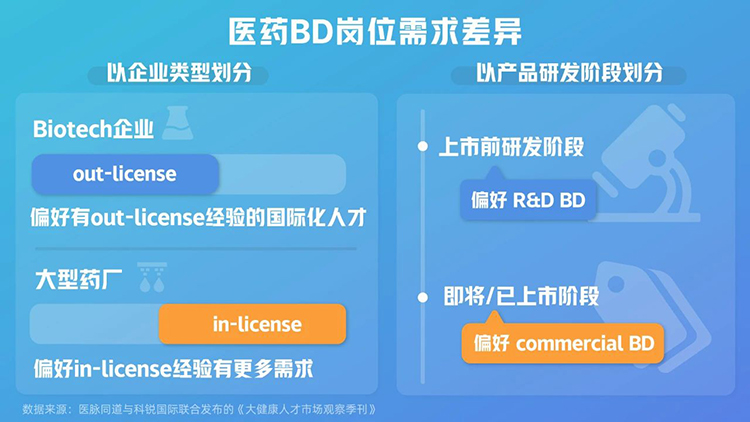 当前环境下,做过成功deal、有人脉资源、有项目谈判落地经验的国际化BD人才是香饽饽。而不同类型的企业,对BD所需具备的能力侧重点会有差异。细分来说,一些现金流比较充裕的大型药企,对于并购/剥离、in-license经验有更多需求;而一些BIOTECH,更需要有out-license经验的国际化人才。而一些传统药企,因其公司本身的研发、销售、市场等能力已经建立起来,需要BD人才具有更强的沟通能力。