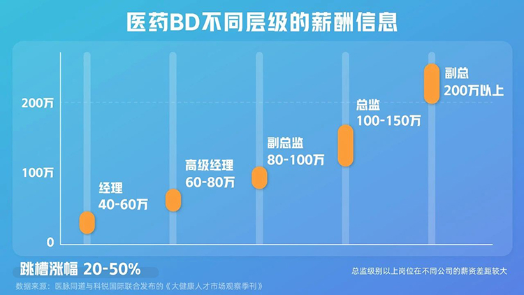 人力资源公司《2023人才市场洞察及薪酬指南》数据,VP级的BD人才年薪最高能拿250万元,超过医药研发的一众岗位,薪酬平均涨幅达到30%。医药BD的薪资除了考察候选人的基本背景,还要参考候选人的过往薪资水平、是否落地过BD项目等因素。