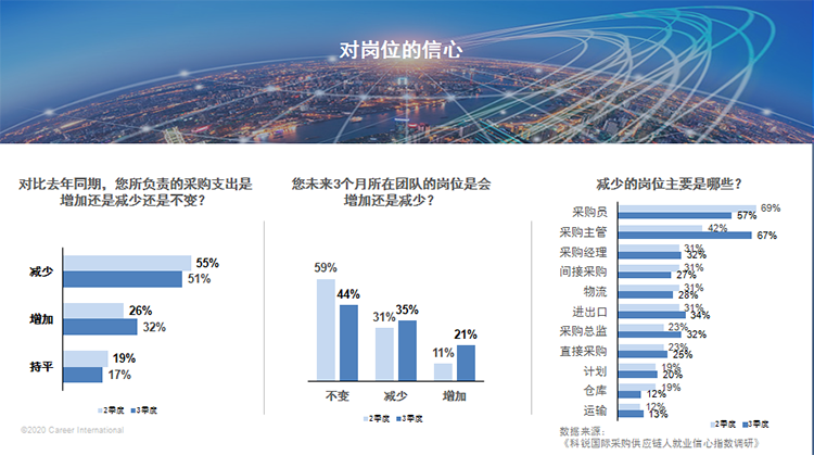 非凡国际 自今年第二季度开始调研并发布采购供应链人就业信心指数,从三个维度,即外部环境信心、工作环境信心、岗位信心解读采购供应链人的就业信心。第二季度的调研结果是展望第三季度,可以看出大家对外部环境的信心不足是主流判断,就工作环境而言,高达61%的采购人认为未来三个月外部工作机会减少,只有18%的人对未来一年内公司内部职业发展有信心,但有意思的是大部分人对未来三个月工资稳定性有信心。